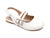 Sandalia coqueta para niña, con diseño cerrado en la punta y detalle de doble hebilla en el empeine. Su ajuste con velcro en el talón asegura comodidad y seguridad durante el día. Perfecta para ocasiones especiales o el uso diario, esta sandalia combina estilo y funcionalidad, brindando soporte y un toque elegante para los pequeños pasos de tu hija. Ideal para cualquier temporada.