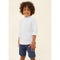 Camisa de manga larga para niño de 3 a 9 años con trabilla y botón en el lateral para poder recogerla y ajustar el largo. Modelo con cuello mao al tono. Cierre con botones en la parte delantera. Tejido de aspecto fresco y actual con lino.