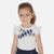 Cuello redondo. Mezcla de tejidos combinados para lograr un diseño único y diferente. Modelo con olanes. Elementos de adorno: dibujo en la parte delantera, glitter.