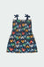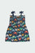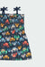 Vestido de punto elástico para niña. Talla de la 2 a 6 años. Es de tirantes finos. La parte del cuerpo va con gomas y la falda es suelta. Lleva estampado de pieza en fondo marino y cangrejos de colores.